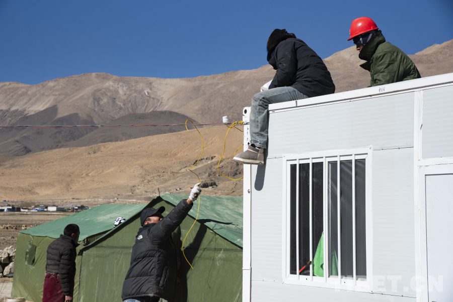 圖為工作人員正在受災(zāi)僧尼安置點(diǎn)活動板房外安裝照明設(shè)備 攝影:趙振宇