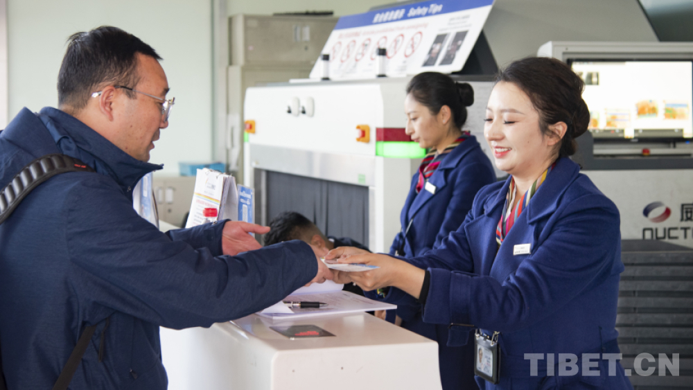 “您好,先生,請問您乘坐藏航哪趟航班?請出示您的身份證。您有托運行李嗎?托運行李中有鋰電池、充電寶嗎?這些是不能托運的,只能隨身攜帶。請拿好您的登機牌。再見,祝您歸途愉快!”1月25日,記者在拉薩貢嘎國際機場T3航站樓G島柜臺,見到了西藏航空公司拉薩基地值機服務隊隊長次仁卓嘎。