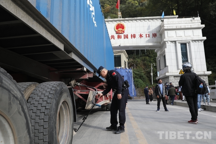 圖為聶拉木邊檢站民警對(duì)出境貨車進(jìn)行查驗(yàn)