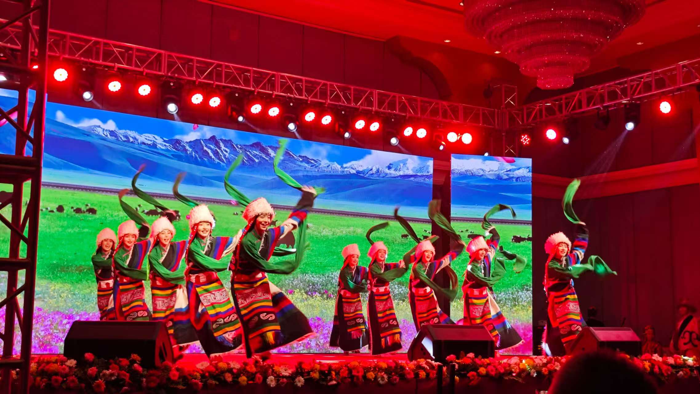 中國西藏山南市藝術(shù)團(tuán)帶來了豐富而精彩的歌舞表演。開場(chǎng)以藏戲《歡騰雅礱》點(diǎn)燃節(jié)日氣氛,獨(dú)唱《扎西德勒》《歡騰的弦子》以及尼泊爾籍藏族女歌者瓊英卓瑪演唱《花的眼睛》,贏得觀眾陣陣掌聲,《祥瑞勒布》《織夢(mèng)》《藏南鼓舞》《班戈諧欽》《弦鼓情緣》《高原舞步》等舞蹈表演體現(xiàn)了西藏各族群眾豐富的精神文化生活,展現(xiàn)了西藏日新月異的發(fā)展變化和迷人的民族風(fēng)情,在場(chǎng)藏胞紛紛為精彩演出鼓掌喝彩。