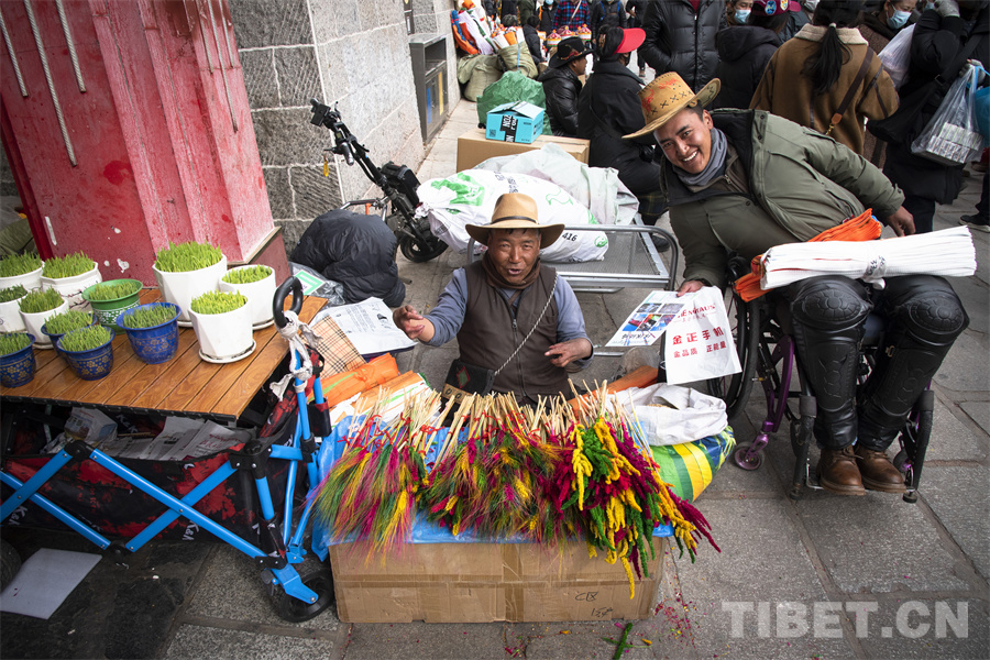 普瓊,來自日喀則市江孜縣,在八廓商城南門前經(jīng)營(yíng)著自己的“羅薩梅朵”小攤。初見普瓊,我們被他沖著鏡頭的燦爛笑容所吸引。細(xì)細(xì)觀察,普瓊坐在地上的身高卻比別人矮了一大截。“我們從拉薩堆龍德慶的批發(fā)市場(chǎng)上買來這批‘羅薩梅朵’在此銷售,就希望能夠在年前的這段時(shí)間多賺些小錢補(bǔ)貼家用,所有人都想在新年之時(shí)過個(gè)充裕的‘好年’,不是嗎?”普瓊因一次意外高位截癱,失去雙腿的他并沒有消沉。他選擇積極面對(duì)生活,用自己的雙手和命運(yùn)抗?fàn)帲脠?jiān)強(qiáng)和勤勞讓自己和全家過上更好的生活。與普瓊不幸的經(jīng)歷相比,我們每個(gè)人過的每個(gè)年何嘗不都是一個(gè)個(gè)“好年”呢?普瓊對(duì)生活的那種熱愛,對(duì)明天會(huì)更好的堅(jiān)定,何嘗不是我們對(duì)每一個(gè)“好年”所孜孜追求的呢?