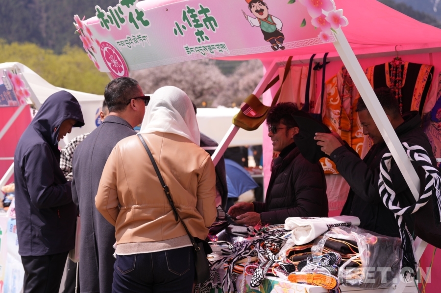 沿著蜿蜒的小路,一邊是錯落有致的桃花樹,一邊是特色集市?!斑@些是工布男女服飾、這是馬套、這是藏式包包……都是我們合作社的工作人員手工制作的?!痹谖枧_一旁的桃花小集市,林芝市巴宜區(qū)絲綢藏裝定制農(nóng)牧民專業(yè)合作社負(fù)責(zé)人尼瑪扎西正向游客一一介紹自家展銷點(diǎn)的產(chǎn)品以及其背后的文化和制作過程。經(jīng)過一番討價還價,一千余元的“大單子”順利成交,游客將一件件精美的巴宜“小禮品”裝進(jìn)袋子和尼瑪扎西揮手告別。
