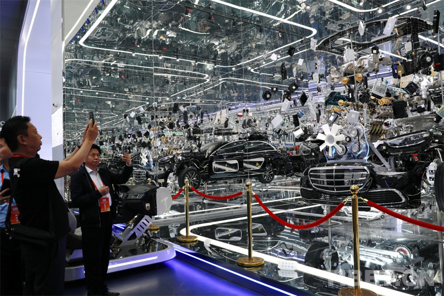 圖為西藏自治區(qū)工商聯(lián)民營企業(yè)家赴京學(xué)習(xí)參觀團(tuán)一行在北方國際汽車教育拍攝奔馳整車吊裝爆炸式工業(yè)藝術(shù)展示 攝影:劉莉