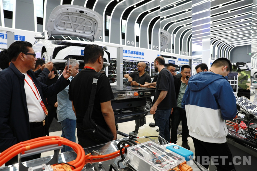 圖為觀摩來自伊朗、埃塞俄比亞等國家的學(xué)生實(shí)操新能源汽車電池組維修 攝影:劉莉