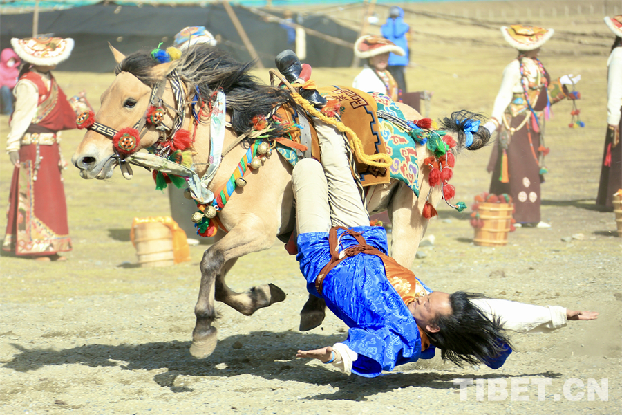 圖為賽馬選手在馬背上展示特技動作 攝影:龍真多吉