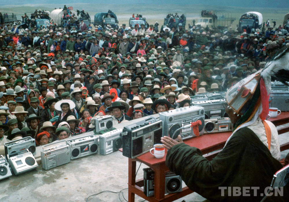 圖為說(shuō)唱藝人阿達(dá)在那曲賽馬會(huì)上說(shuō)唱《格薩爾》的傳奇故事,臺(tái)上擺滿(mǎn)了牧民群眾的各式錄音機(jī)(唐召明提供,才龍1987年前后攝)