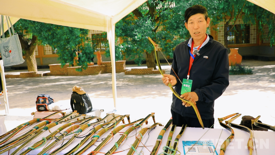 馬國(guó)財(cái)是一位來(lái)自青海省海東市樂都區(qū)的南山傳統(tǒng)牛角弓非遺傳承人,自曾祖父起他家在制作牛角弓方面的技藝是家喻戶曉的。他深受父輩的影響,做弓技藝更是嫻熟。此次活動(dòng),他帶來(lái)了自己的幾十張得意之作“南山傳統(tǒng)牛角弓”,在現(xiàn)場(chǎng)向?qū)ε=枪信d趣的游客耐心地講解選材、打磨、粘合、鋪筋、扎把、陰干、調(diào)試、加牛角、打磨、貼樺皮、上色等弓箭的制作過程,以及在生活當(dāng)中的實(shí)際應(yīng)用,讓更多的人了解到它不僅僅是一張普通的弓,更是祖祖輩輩的智慧結(jié)晶和珍貴非遺。