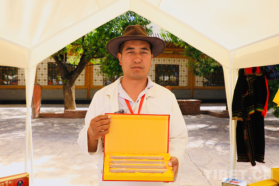 “我今天主要帶來(lái)的是我們的工藝產(chǎn)品‘供養(yǎng)藏香’,這些包裝樣式不一的藏香根據(jù)規(guī)格大小都有各自的價(jià)位,但每一根藏香上付出的心血及所使用的工藝和配料都一致,其中我們也更注重藏香的配料,都是精心篩選的白檀香、藏紅花、安息香、白黑沉香、甘松等二十多種源自高原的天然藥物和香味植物?!碑?dāng)問到目前的銷售情況時(shí),他坦言道:“今天賣出去的并不是很多,不過今天能和眾多的優(yōu)秀手工藝人同臺(tái)參展機(jī)會(huì)難得,對(duì)我來(lái)說也是一種學(xué)習(xí)和展現(xiàn)的契機(jī)?!?/p>