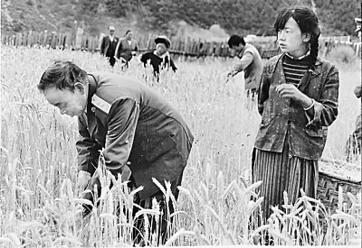 1990年,陰法唐乘汽車從青藏公路赴西藏,途中和群眾收割青稞。