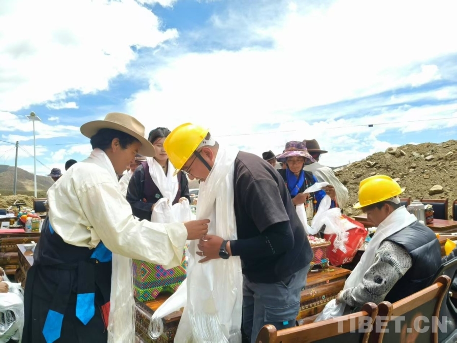 圖為村民向施工隊(duì)工作人員敬獻(xiàn)哈達(dá)。