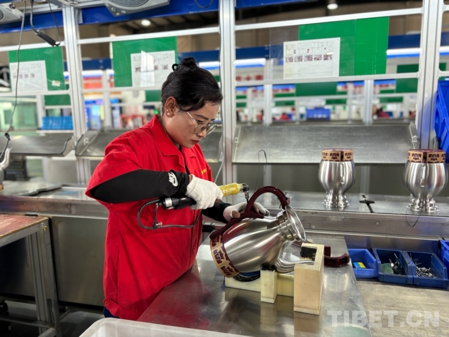 圖為員工央宗正在安裝全自動酥油茶壺手柄
