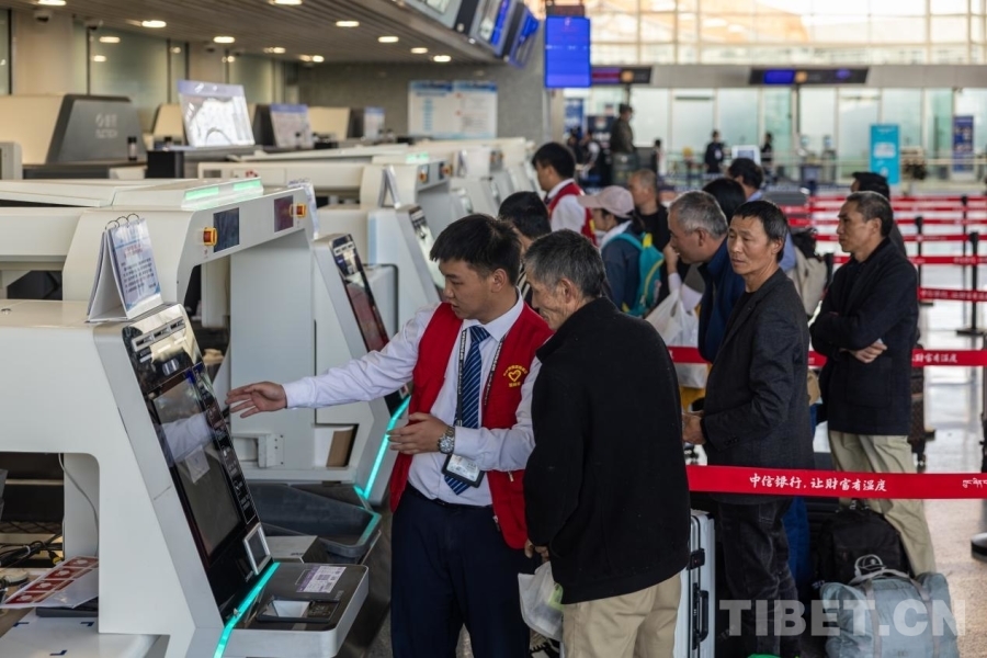 圖為機場志愿者幫助旅客辦理手續(xù) 民航西藏自治區(qū)管理局供圖