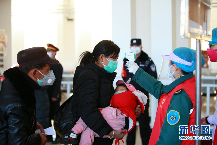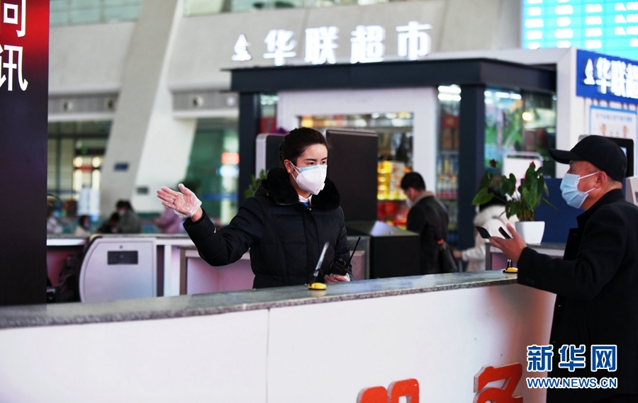 德令哈車站工作人員為進站旅客測量體溫。新華網(wǎng) 汪要強 攝