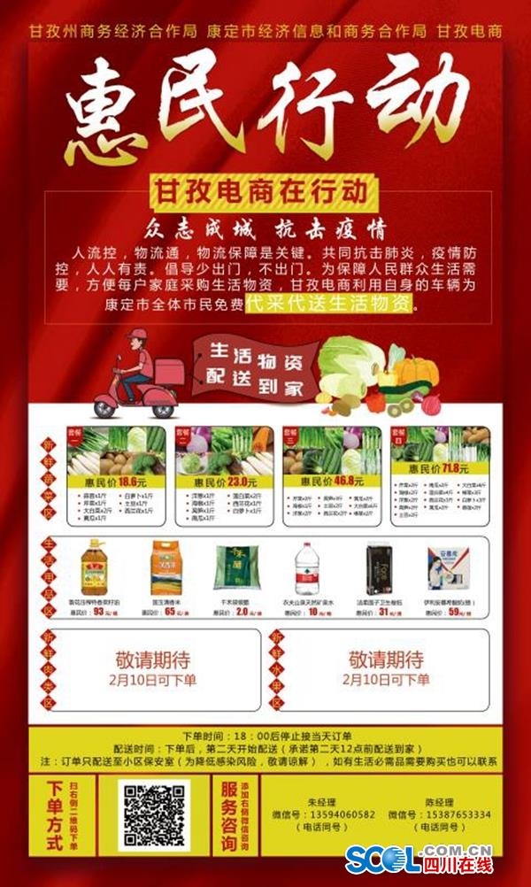 據(jù)悉,這是四川省甘孜州商務(wù)和經(jīng)濟合作局為配合防疫工作,降低市民出行交叉感染的幾率,聯(lián)合康定市經(jīng)合局、爐城和榆林2個街道辦9個社區(qū)、圣潔甘孜扶貧超市、康定民貿(mào)公司、康定鄰你超市、順豐甘孜快遞等企業(yè)和單位,為居住在康定新老城區(qū)的居民,專門開展的“防疫套餐”送貨上門惠民行動。