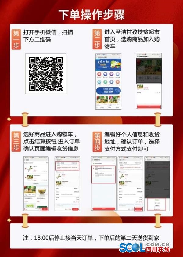 “防疫套餐”送貨上門惠民行動從2月9日開始試運行,2月10日第一批蔬菜貨物正式送到家。家住在康定市新老城區(qū)的市民,只需通過掃描電子宣傳單的二維碼,進入圣潔甘孜扶貧超市首頁,選購商品加入購物車,點擊結(jié)算,進入訂單確認(rèn)頁面編輯收貨信息,之后確認(rèn)訂單選擇支付方式支付即可。當(dāng)天下單,最遲第二天就能在家免費收貨。