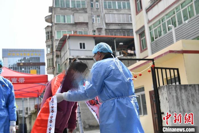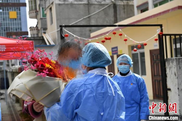 醫(yī)護(hù)人員向郭某某送上鮮花。 周旺波 攝