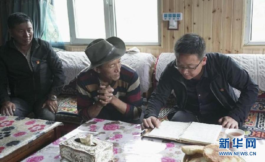 青海省玉樹藏族自治州囊謙縣覺拉鄉(xiāng)尕少村第一書記麻成學(右)在農(nóng)牧民家中走訪(2019年8月30日攝)。新華社記者 李亞光 攝