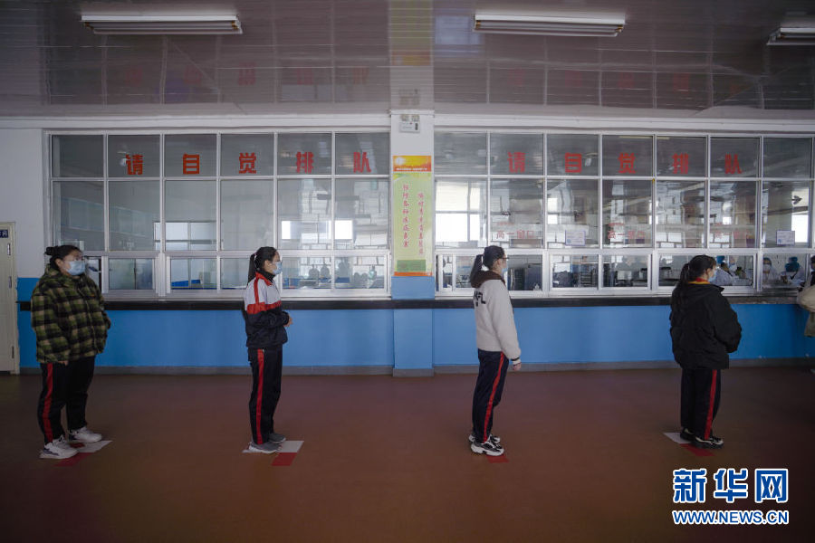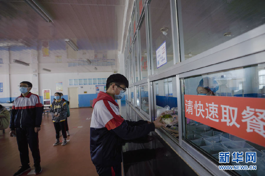 3月14日,海北州第一高級中學學生在餐廳排隊取餐。新華社 吳剛 攝