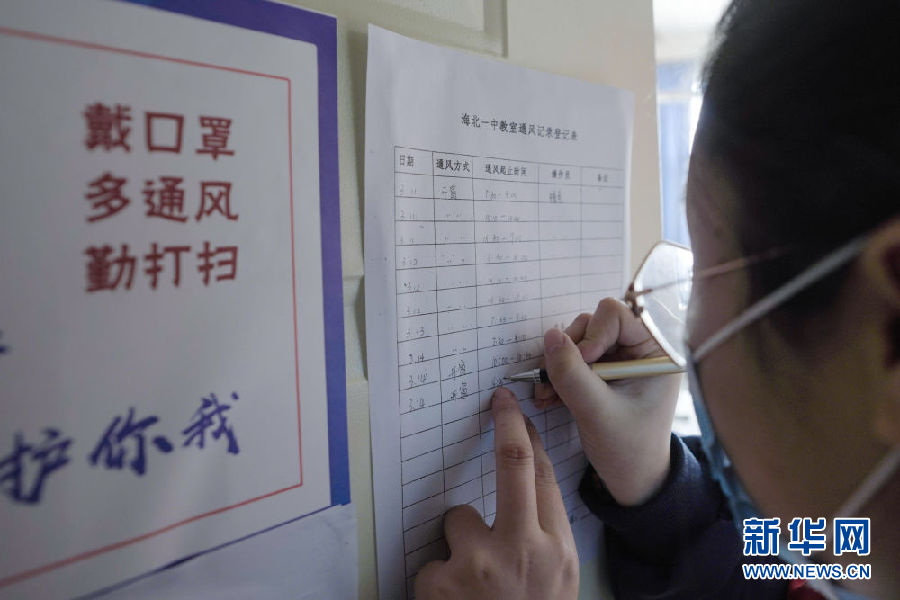 3月14日,海北州第一高級中學學生柳逢靈在記錄教室通風情況。新華社 吳剛 攝