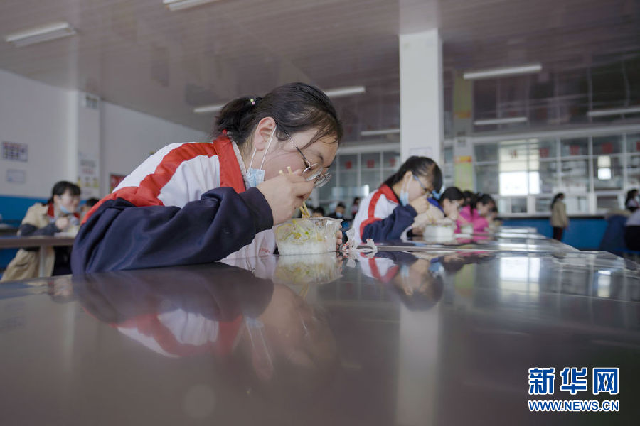 3月14日,海北州第一高級中學的學生正在餐廳分桌就餐。新華社 吳剛 攝