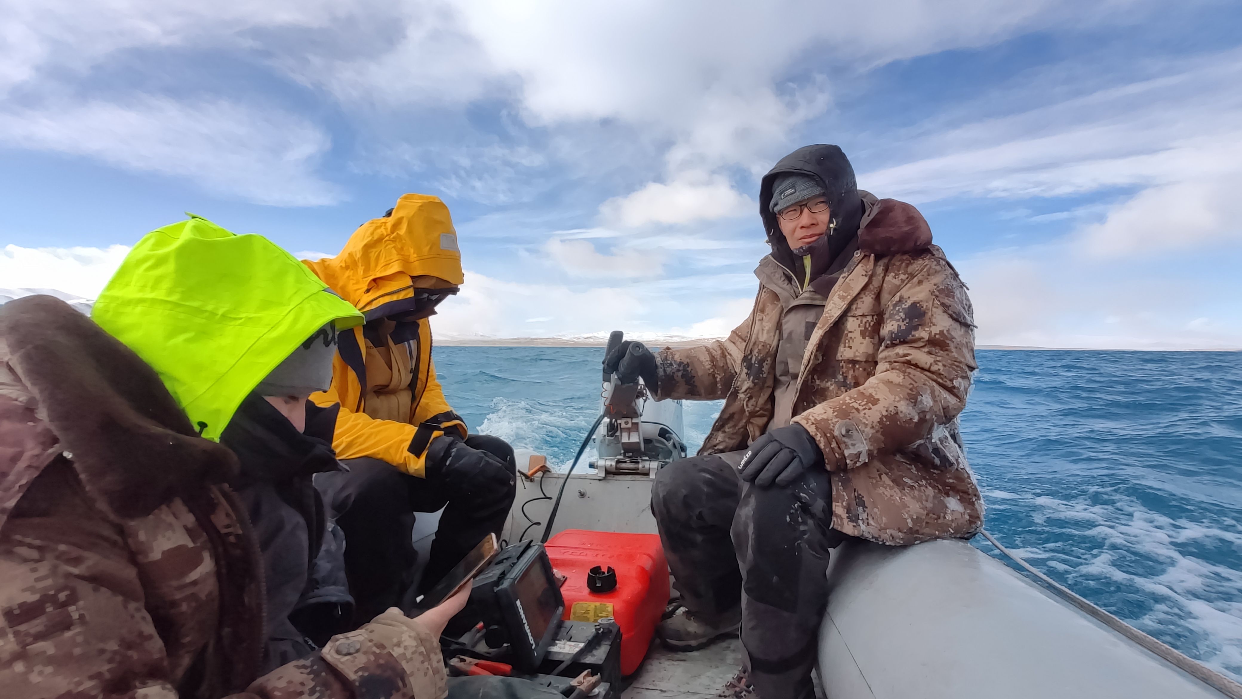 慢慢地,科考隊掌握了規(guī)律——湖面經(jīng)常下午四五點起風(fēng)。為躲避風(fēng)浪,隊員們冒著低溫早起工作,下午起風(fēng)的時候收隊。如果天氣好,趕上哪天下午沒怎么刮風(fēng),大家就一鼓作氣干到晚上十一二點再回營。