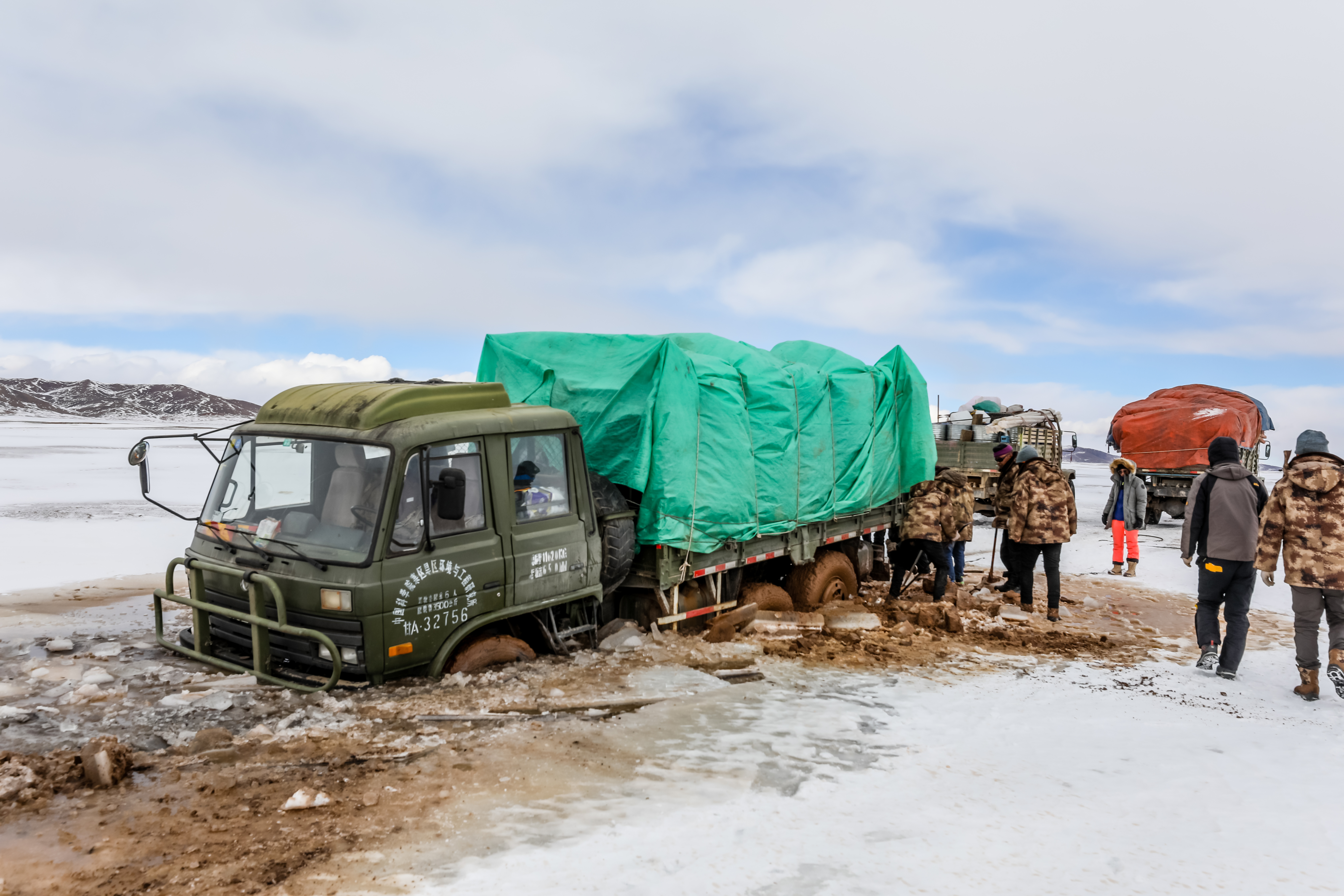 最后一次陷車臨近山的埡口,大雪掩蓋了尚未冰封凍實的小池塘。小型越野車通過后,大卡車順著車轍前行,深陷池塘。此時天已擦黑,狂風(fēng)呼嘯,科研人員只好把卡車上4噸的物品全部卸下,將車拖出,再進行裝車?!傲阆率畮讛z氏度,5級風(fēng)的情況下,我們在那里折騰了4個小時?!?/p>
