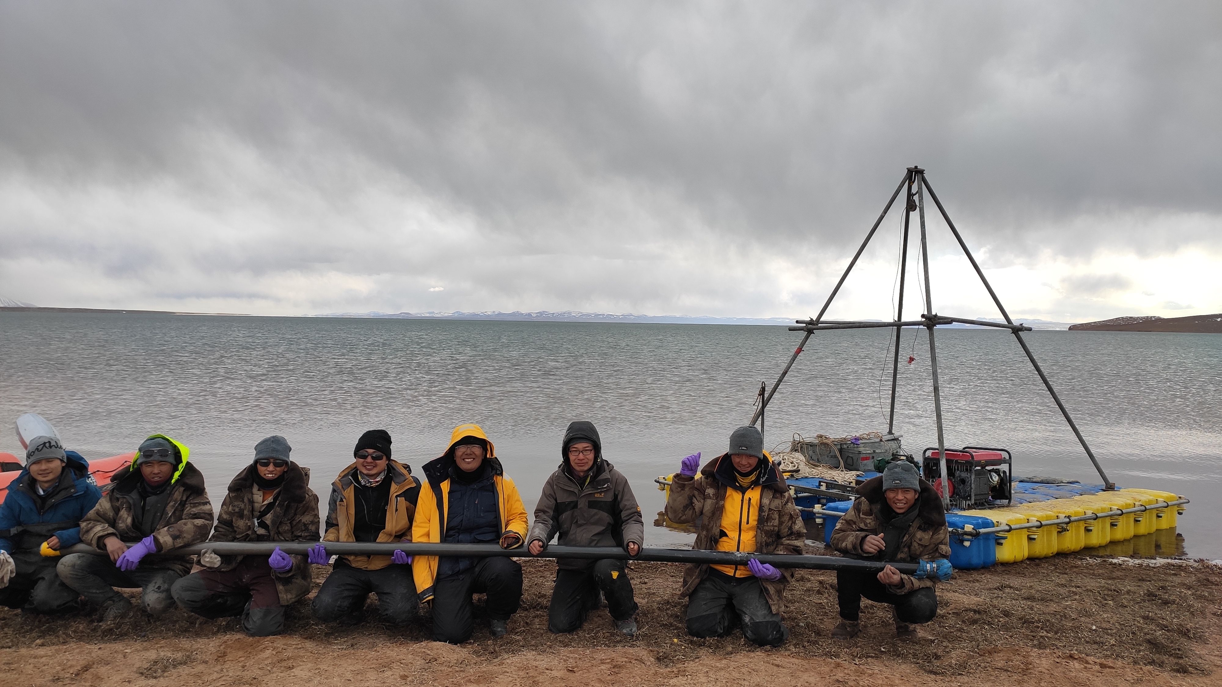 鉆取湖泊巖芯是個“力氣活”,隊員們需要協(xié)同完成下鉆、錘擊、提鉆、封管的工作??瓶既藛T用浮筒組成20平方米的采樣平臺,拋錨穩(wěn)定后將取樣管觸到湖底,通過重錘擊打使沉積物樣本進入管中,再將重重的取樣管提起。