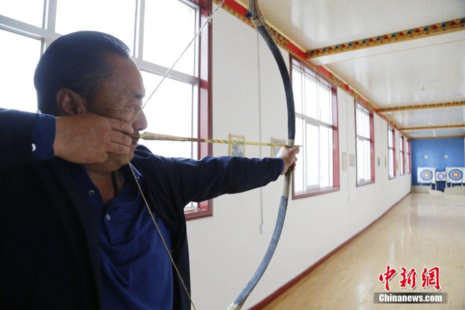 4月22日,青海省尖扎縣傳統(tǒng)牛角弓制作技藝代表性傳承人奧松多杰在車間射箭場(chǎng)內(nèi)測(cè)試制作好的牛角弓。當(dāng)日,在青海省尖扎縣,奧松多杰和徒弟們經(jīng)過(guò)切割,打磨水牛角和竹片、貼筋、繪圖等技藝,純手工制作出藏式傳統(tǒng)牛角弓。中新社記者 馬銘言 攝