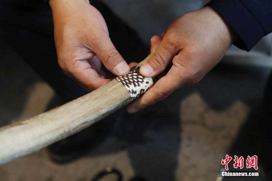 4月22日,青海省尖扎縣傳統(tǒng)牛角弓制作技藝代表性傳承人奧松多杰將蛇皮貼于已經(jīng)陰干的牛角弓上。當(dāng)日,在青海省尖扎縣,奧松多杰和徒弟們經(jīng)過(guò)切割,打磨水牛角和竹片、貼筋、繪圖等技藝,純手工制作出藏式傳統(tǒng)牛角弓。中新社記者 馬銘言 攝