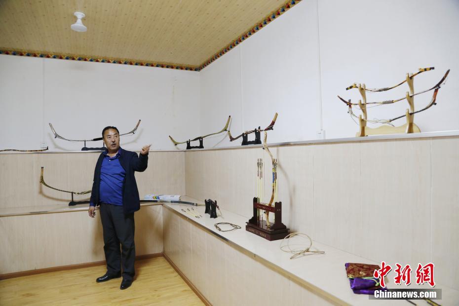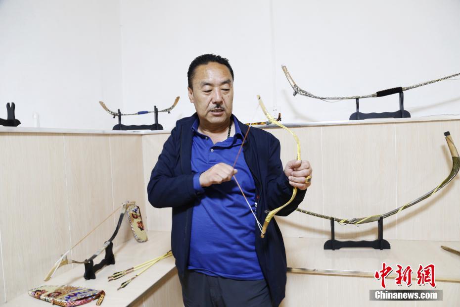 4月22日,青海省尖扎縣傳統(tǒng)牛角弓制作技藝代表性傳承人奧松多杰展示自己與徒弟制作的藏式傳統(tǒng)牛角弓。當(dāng)日,在青海省尖扎縣,奧松多杰和徒弟們經(jīng)過(guò)切割,打磨水牛角和竹片、貼筋、繪圖等技藝,純手工制作出藏式傳統(tǒng)牛角弓。中新社記者 馬銘言 攝