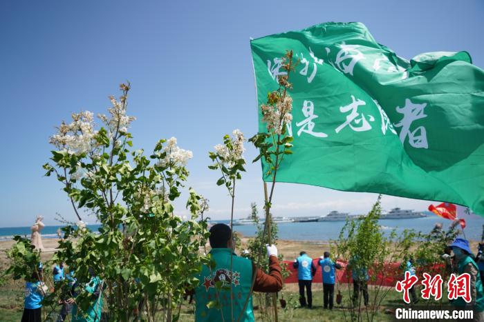 22日上午,200余名志愿者們?cè)谇嗪:戏N植了丁香、榆葉梅和水栒子等適應(yīng)青藏高原高寒氣候的耐寒、耐鹽堿樹(shù)種共300多棵。