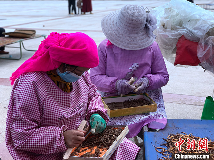 記者了解到,目前整個(gè)雜多蟲草廣場(chǎng)有十幾位刷草工,他們拿著折疊凳來(lái)回穿梭,碰到有需求的商家后立即就地干活。他們的收入由刷蟲草的數(shù)量決定,像王秀花這樣熟練的刷草工,一天能刷三四千根?!案刹輧擅瑵癫菀幻?,一天也能賺四五百塊錢?!蓖跣慊ㄕf(shuō)。
