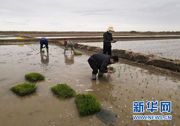 在青海省海西蒙古族藏族自治州格爾木市河西農(nóng)場,袁隆平海水稻科研團隊的工作人員在試驗田進行人工插秧(6月15日攝)。新華社發(fā)(青島海水稻研究發(fā)展中心供圖)