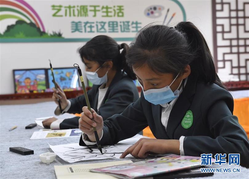 四川省阿壩藏族羌族自治州九寨溝縣九寨溝小學(xué)(原漳扎鎮(zhèn)小學(xué))的學(xué)生在上國(guó)畫課(6月18日攝)。 新華社記者 劉坤 攝