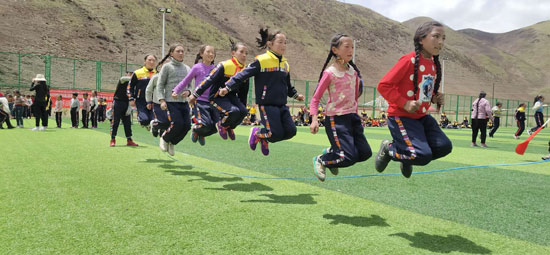 新修的操場是他“套路”到的,400米的標(biāo)準(zhǔn)跑道,比縣里小學(xué)的那個(gè)還好。這原本是鄉(xiāng)里的文體設(shè)施,班瑪多杰軟磨硬泡,央求著領(lǐng)導(dǎo)批準(zhǔn),把這個(gè)操場修到了學(xué)校旁邊?!傲弧敝?,一場運(yùn)動(dòng)會(huì)就在這個(gè)操場上舉辦了。跑步,拔河,跳遠(yuǎn)……