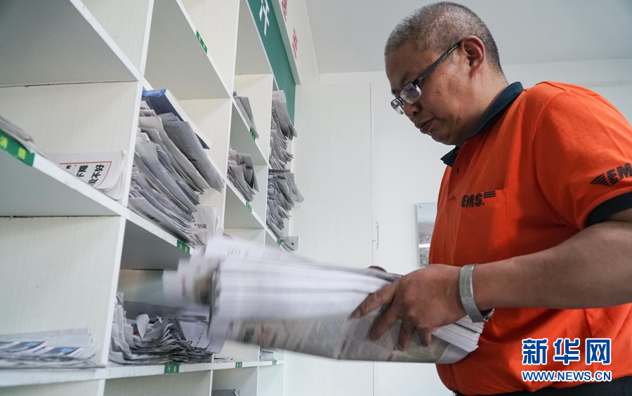 6月29日,中國郵政集團有限公司格爾木市分公司的郵件分揀大院里,葛軍在整理報紙。新華社記者 耿輝凰 攝