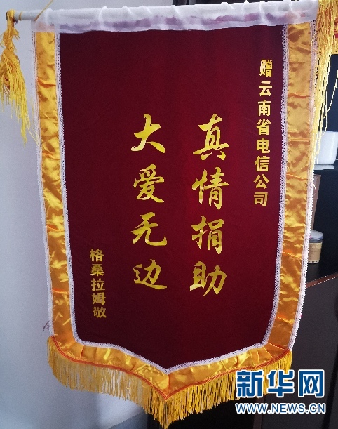 2019年9月,格桑拉姆將書有“真情捐助 大愛無邊”字樣的錦旗,送到前來燕門鄉(xiāng)調(diào)研的中國電信云南公司黨委書記、總經(jīng)理王宏手上,以表達(dá)自己的感激之情。