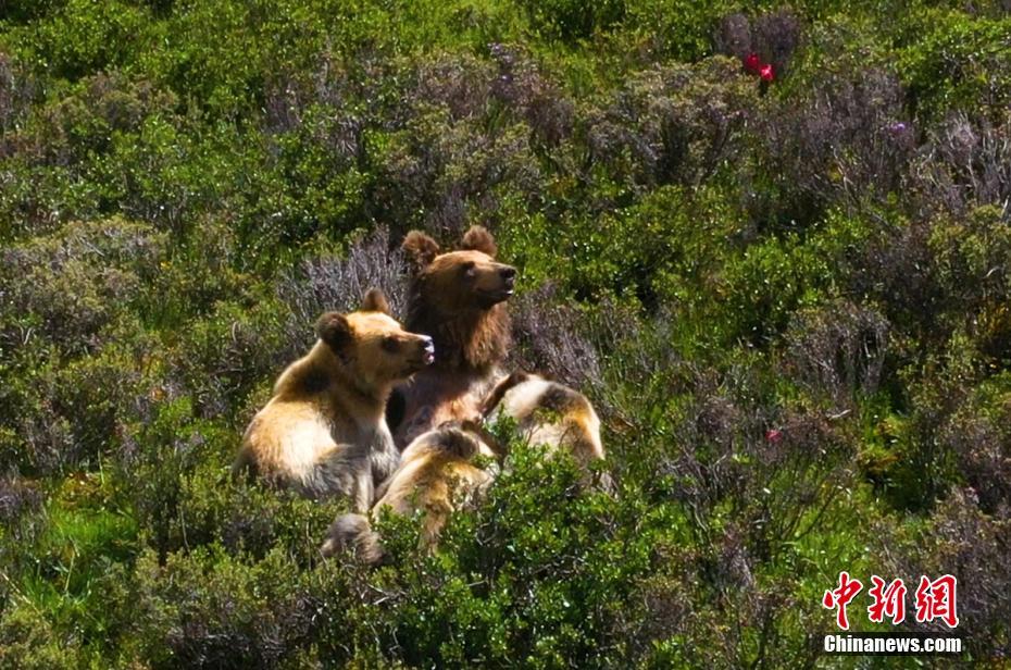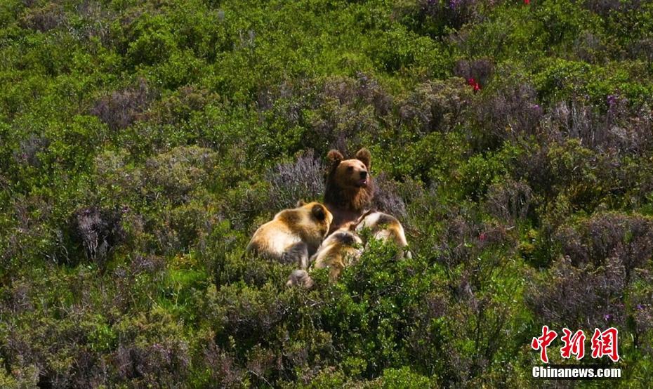7月13日下午,記者下鄉(xiāng)采訪途中,在海拔4500米的四川省甘孜藏族自治州石渠縣蒙宜鎮(zhèn)蒙格村附近一處水草豐茂的山坡處拍攝時,偶然發(fā)現(xiàn)一只棕熊媽媽曬著陽光浴給三只小熊喂奶場景,棕熊媽媽喂奶結(jié)束后領著小熊寶寶們緩慢走向大山深處。