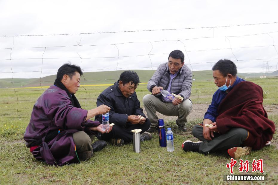 7月21日,青海省海北藏族自治州剛察縣伊克烏蘭鄉(xiāng)剛察貢麻村的索南木旦巴(左一)、仁增才讓(左二)、吉科加(右二)、萬瑪扎西(右一)四人在撿拾著草場垃圾途中,吃餅子,喝礦泉水充饑。2008年,萬瑪扎西路在村支書的支持下,與索南木旦巴、仁增才讓、吉科加三個人組建了義務(wù)環(huán)保隊,自此一干就是12年。他們在撿拾垃圾的同時進行著環(huán)保宣傳,希望從源頭減少垃圾。仁增才讓說:“現(xiàn)在草原上的垃圾幾乎是看不到了?!敝行律缬浾?馬銘言 攝