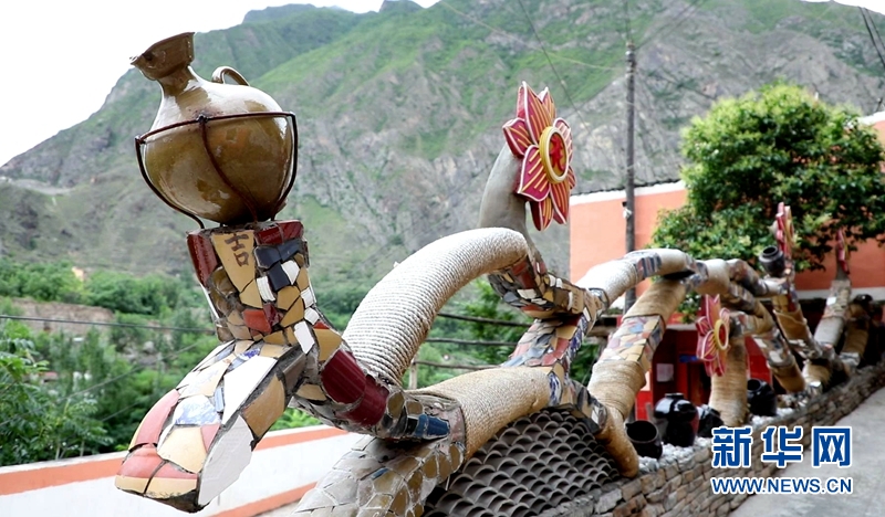 謝家村村民用廢棄的瓦片、瓷罐建起的“花開舟曲”小景觀。王生元 攝