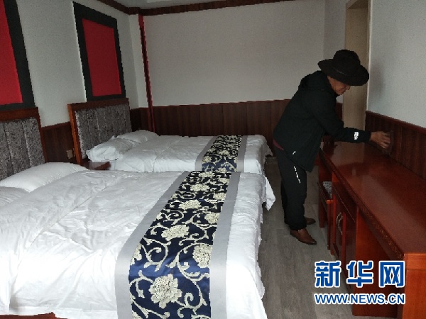 格日扎西正在打掃客房。新華網 宋燕 攝