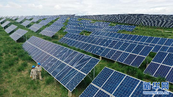 7月8日,在青海省海南藏族自治州共和縣,大唐青海公司新能源分公司兩名工作人員在光伏電站內巡檢(無人機照片)。新華社記者 張宏祥 攝