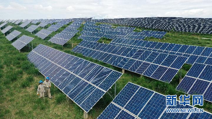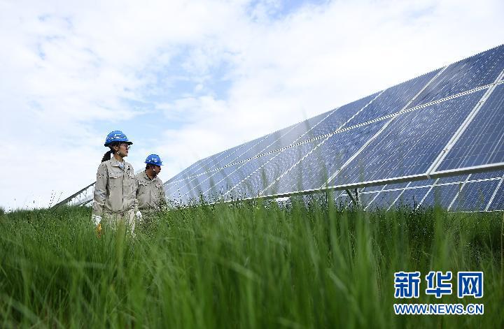 7月8日,在青海省海南藏族自治州共和縣,大唐青海公司新能源分公司兩名工作人員在光伏電站內巡檢。新華社記者 張宏祥 攝