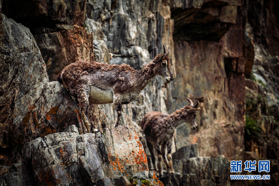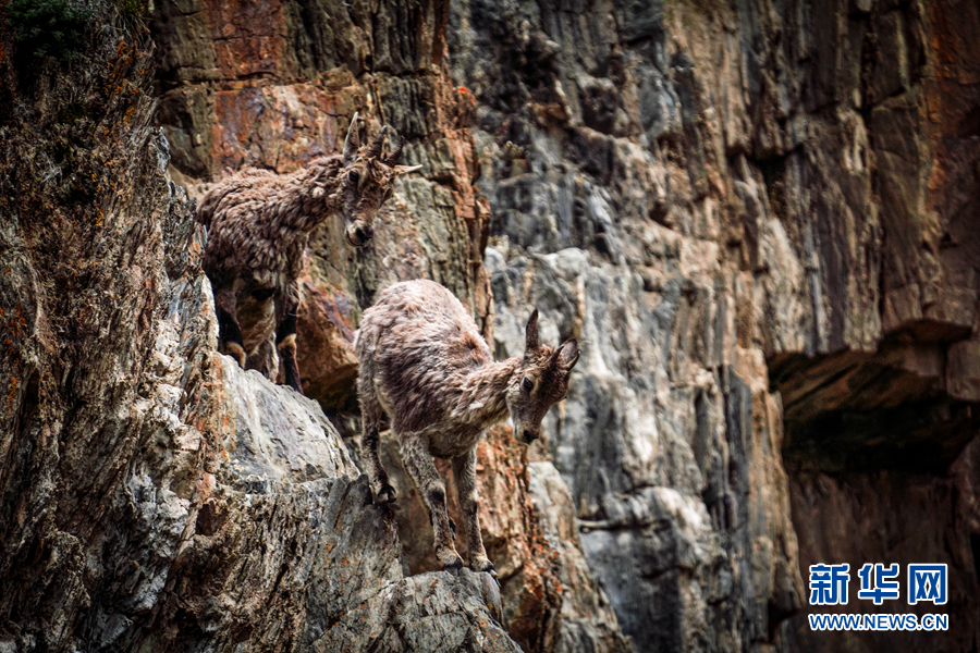 兩只巖羊在巖壁上行走。新華網(wǎng) 宋忠勇 攝