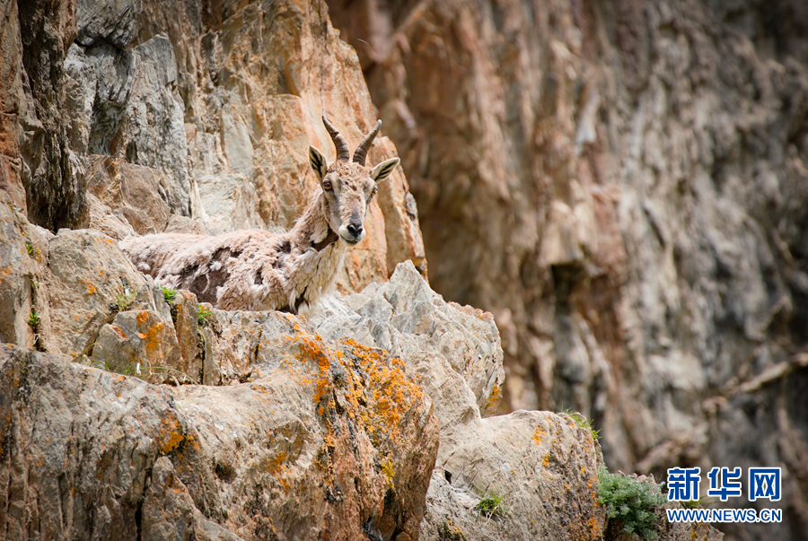 兩只巖羊站在巖壁上俯瞰。新華網(wǎng) 宋忠勇 攝