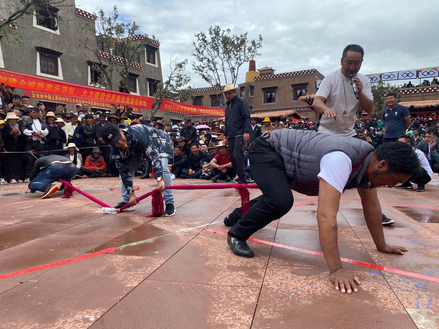 滾桶接力選手們的一次次翻跟斗,穿輪胎更是引得觀眾一次次開懷大笑。緊接著扳手腕、穿藏服揉糌粑、套牛角等游戲一個接一個輪番上陣,現(xiàn)場啦啦隊吶喊助威、熱情高漲,加油聲此起彼伏,讓整個賽場沸騰起來。
