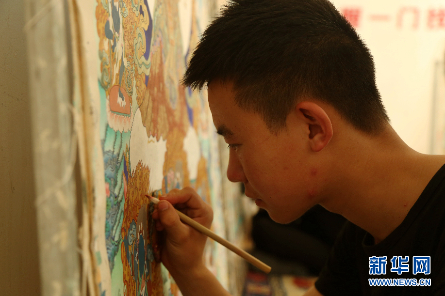 在青海省黃南藏族自治州同仁市龍樹畫苑的畫室內(nèi),十幾個年輕人盤腿而坐,手握著畫筆,細(xì)細(xì)勾勒。