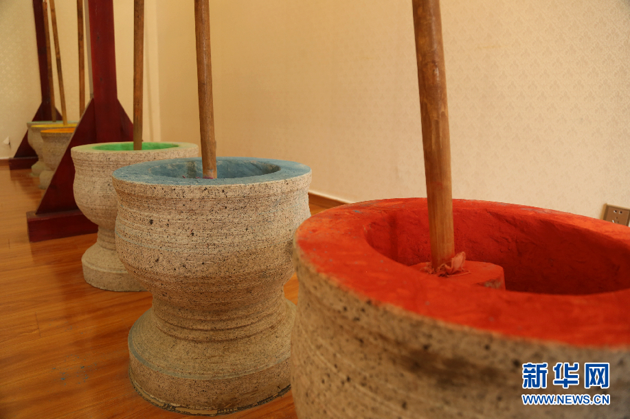 圖為顏料碾磨室。繪制唐卡的顏料由純天然的礦物制成,色彩鮮艷、歷久彌新。新華網(wǎng) 卡婭梅朵攝