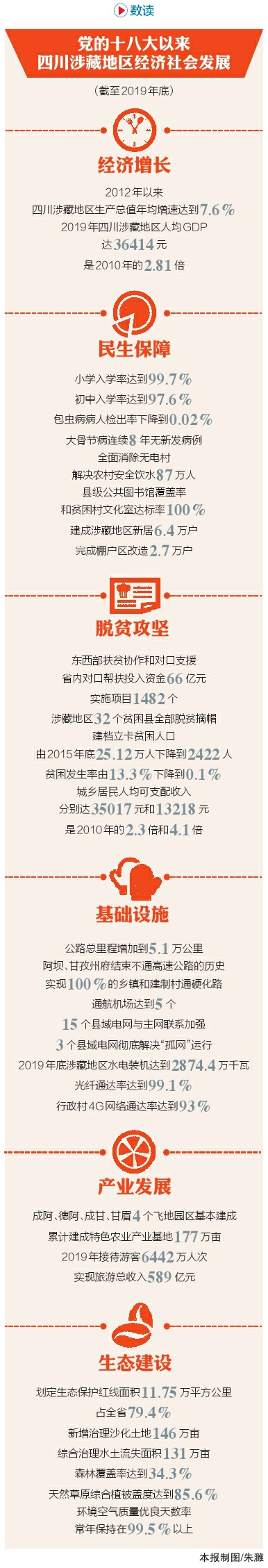省委涉藏辦相關(guān)負(fù)責(zé)人告訴記者,近年來四川省涉藏地區(qū)加快發(fā)展特色優(yōu)勢產(chǎn)業(yè),推動(dòng)全域旅游、高原農(nóng)牧業(yè)、清潔能源、民族手工藝等提質(zhì)增效。依托大熊貓、大九寨、大香格里拉、大草原等特色資源,涉藏地區(qū)大力發(fā)展全域旅游,“凈土阿壩”“圣潔甘孜”“大涼山”品牌影響力不斷提升,阿壩州、甘孜州成功創(chuàng)建首批國家級(jí)全域旅游示范區(qū),2019年接待游客6442萬人次、實(shí)現(xiàn)旅游總收入589億元。涉藏地區(qū)重點(diǎn)發(fā)展高原牦牛、特色果蔬、釀酒葡萄、優(yōu)質(zhì)青稞、道地中藏羌藥材、野生食用菌等產(chǎn)業(yè),基本建成成阿、德阿、成甘、甘眉4個(gè)飛地園區(qū);大力推進(jìn)清潔能源建設(shè),水電裝機(jī)容量達(dá)到2875.6萬千瓦。截至2019年底,四川涉藏地區(qū)人均GDP達(dá)到36414元,是2010年的2.81倍;城鄉(xiāng)居民人均可支配收入分別達(dá)到35017元、13218元,接近全省平均水平,向2020年底實(shí)現(xiàn)全面同步小康邁出了堅(jiān)實(shí)一步。