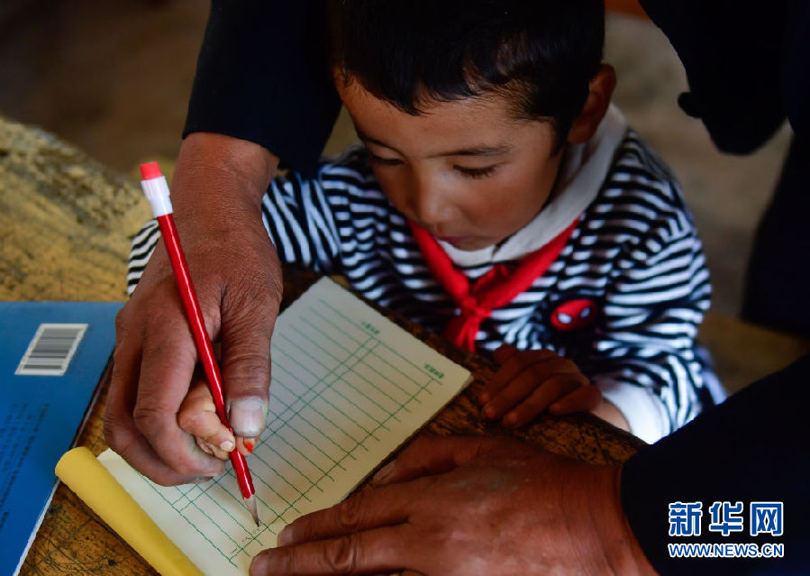 8月31日,在來(lái)塘村學(xué)校,完么仁增老師在指導(dǎo)一年級(jí)學(xué)生馬文輝學(xué)習(xí)。新華社記者 張龍 攝